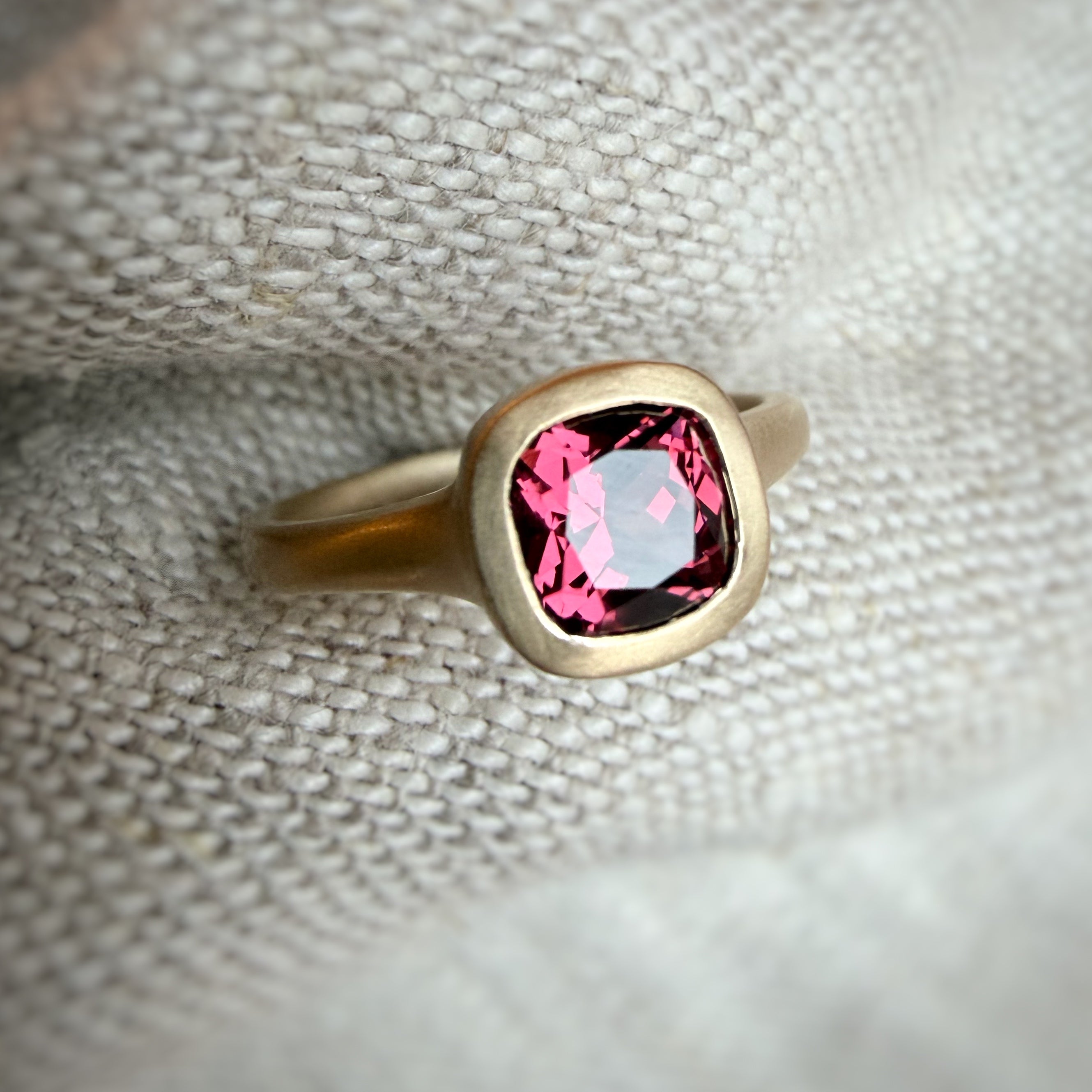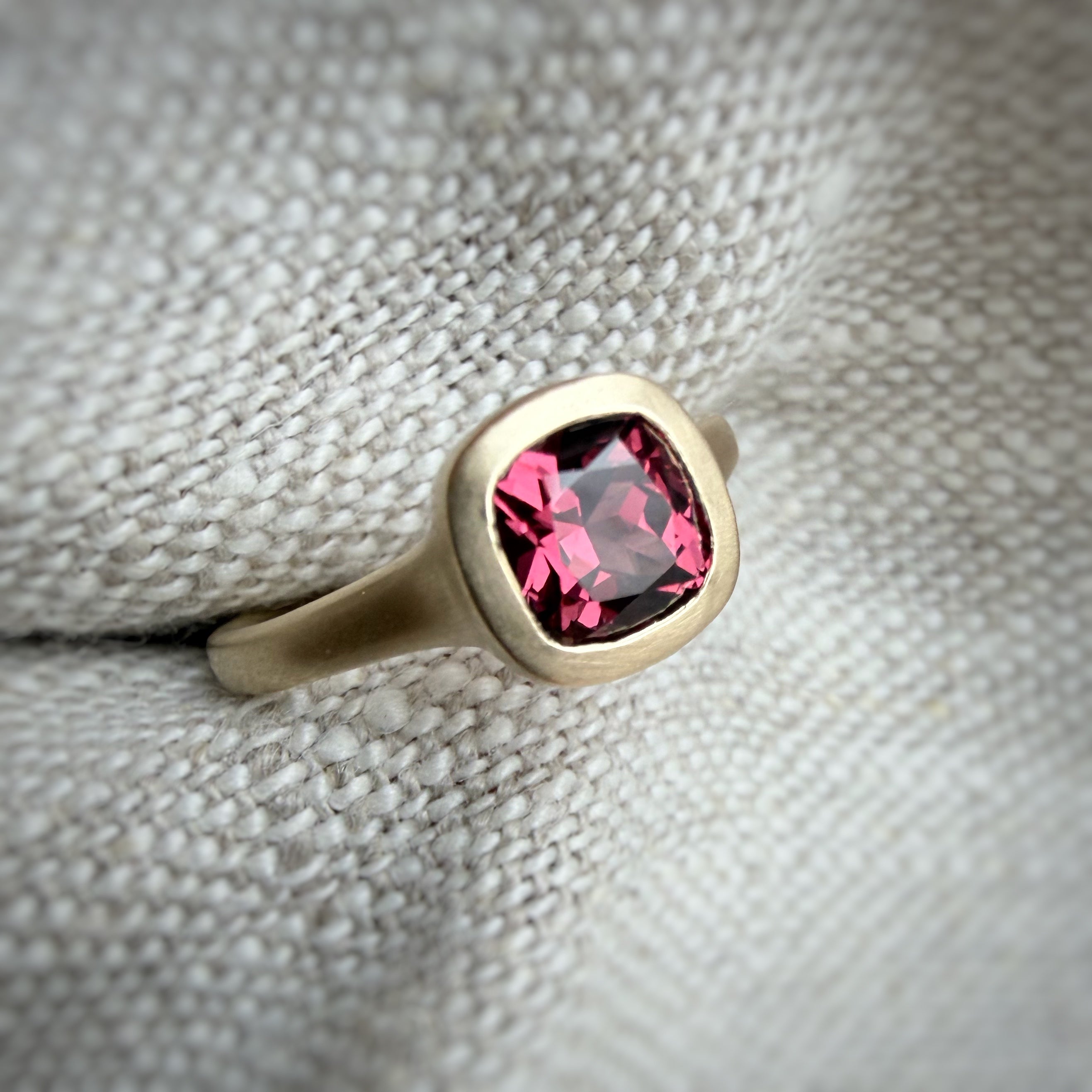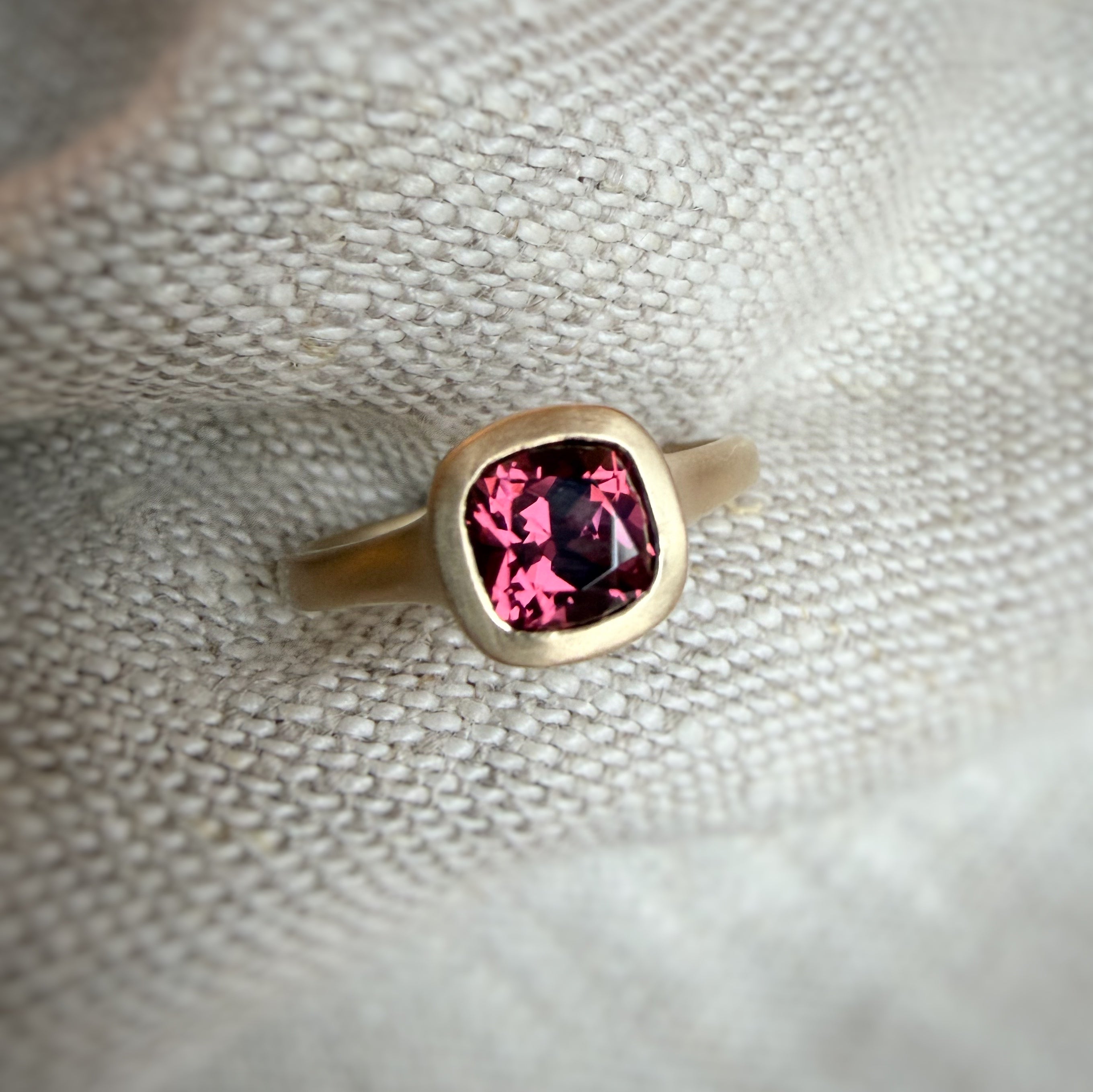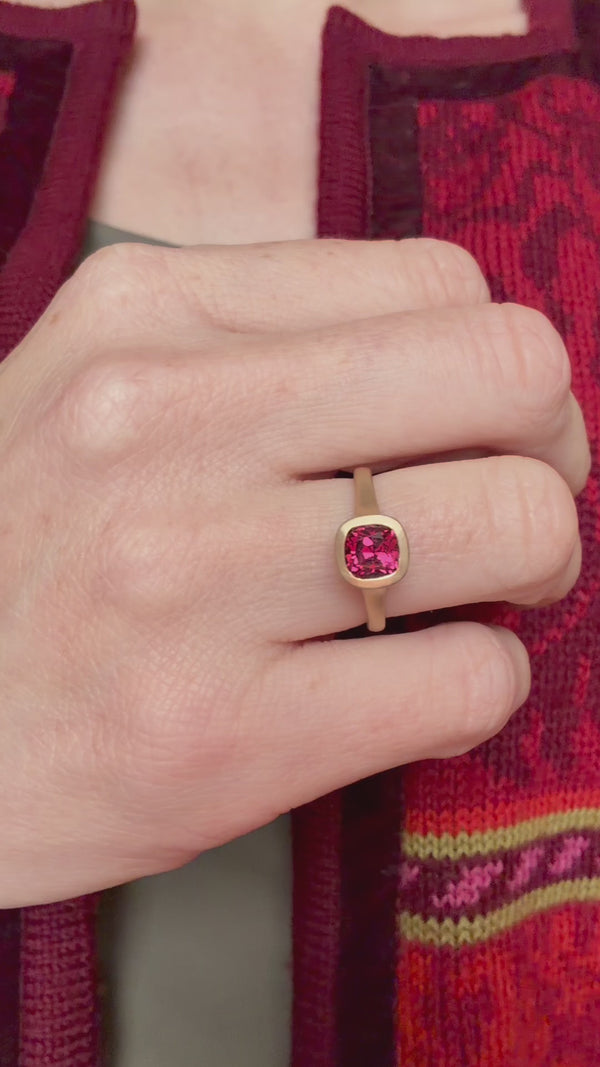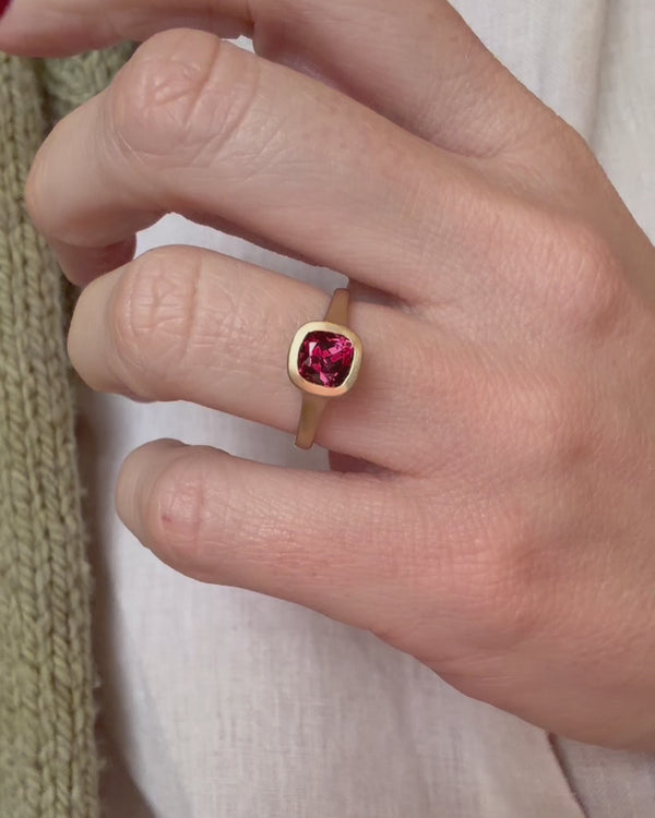 Featuring a 1.5 ct cushion cut umbalite garnet, in a beautifully vivid berry tone.
