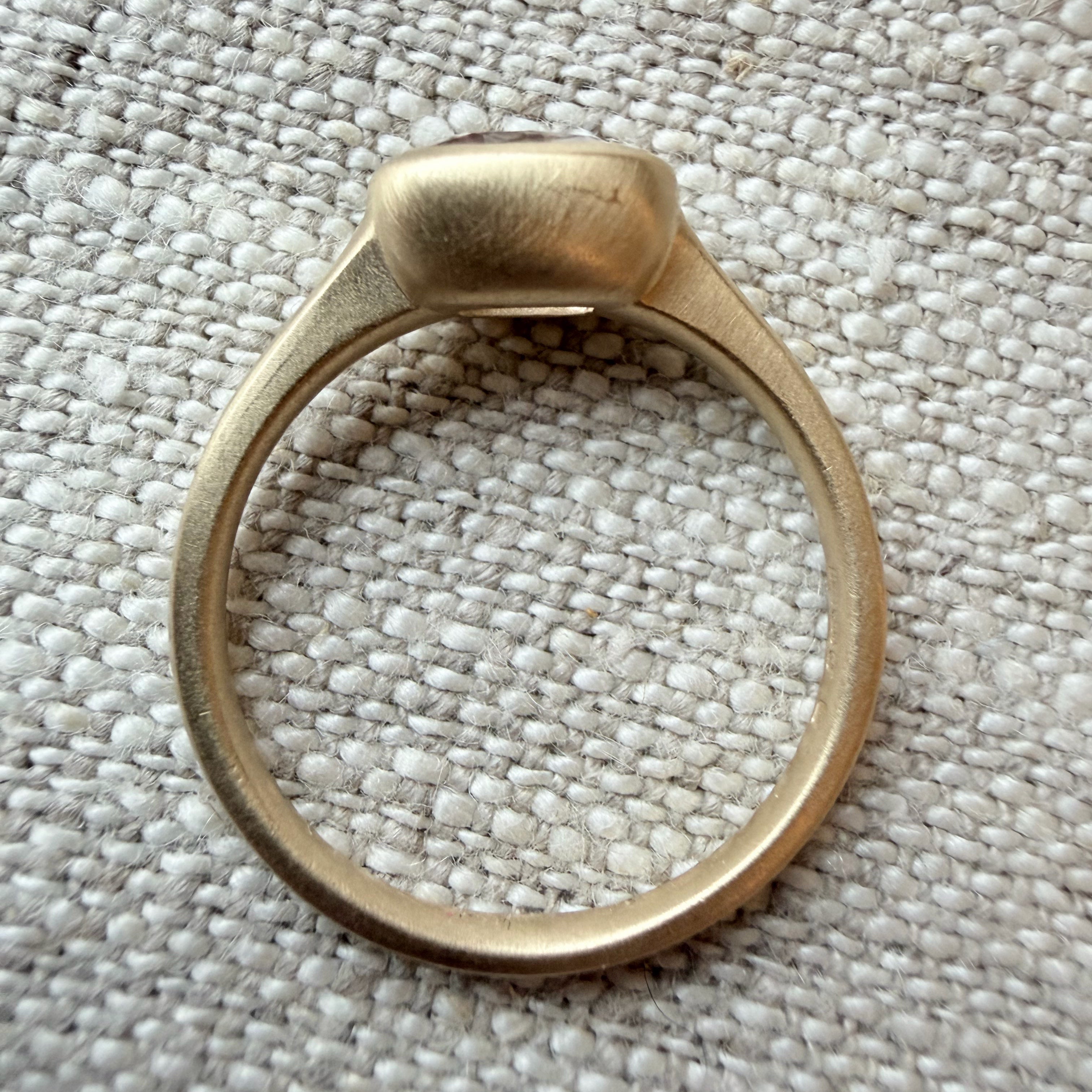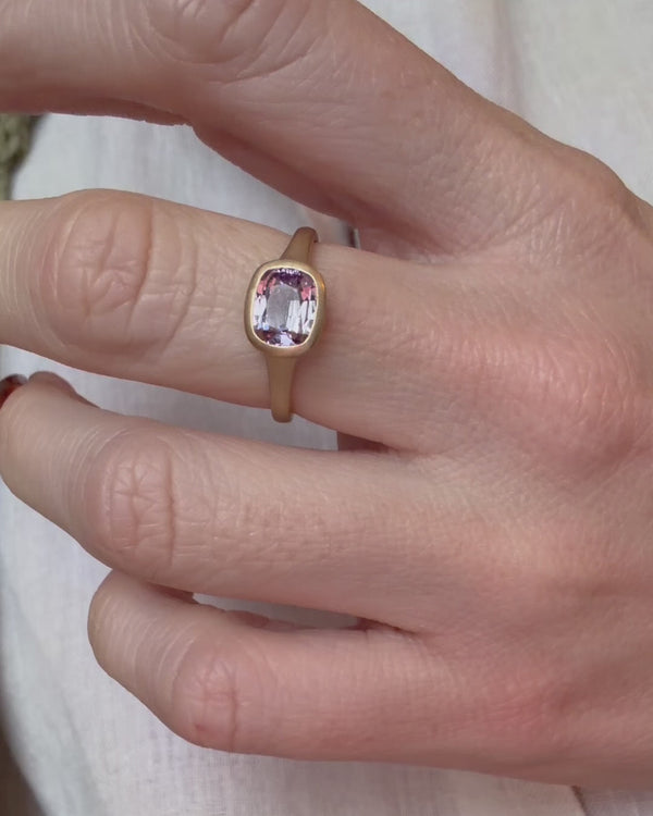 Featuring a 1.1 ct unheated pink elongated cushion cut tanzanite. We were especially thrilled by tihis stone as tanzanite is not commonly pink, and this stone is completely untreated!